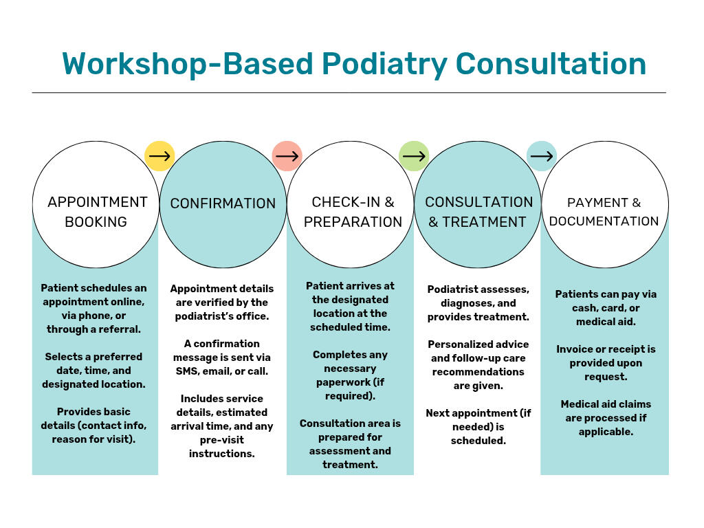 1. Appointment Booking> lPatient schedules an appointment online, via phone, or through a referral.> Selects a preferred date, time, and designated location.> Provides basic details (contact info, reason for visit).2. Confirmation> Appointment details are verified by the podiatrist’s office.> A confirmation message is sent via SMS, email, or call.> Includes service details, estimated arrival time, and any pre-visit instructions.3. Check-in & Preparation> Patient arrives at the designated location at the scheduled time.> Completes any necessary paperwork (if required).> Consultation area is prepared for assessment and treatment.4. Consultation & Treatment> Podiatrist assesses, diagnoses, and provides treatment.> Personalized advice and follow-up care recommendations are given.> Next appointment (if needed) is scheduled.5. Payment & Documentation> Patients can pay via cash, card, or medical aid.> Invoice or receipt is provided upon request.> Medical aid claims are processed if applicable.