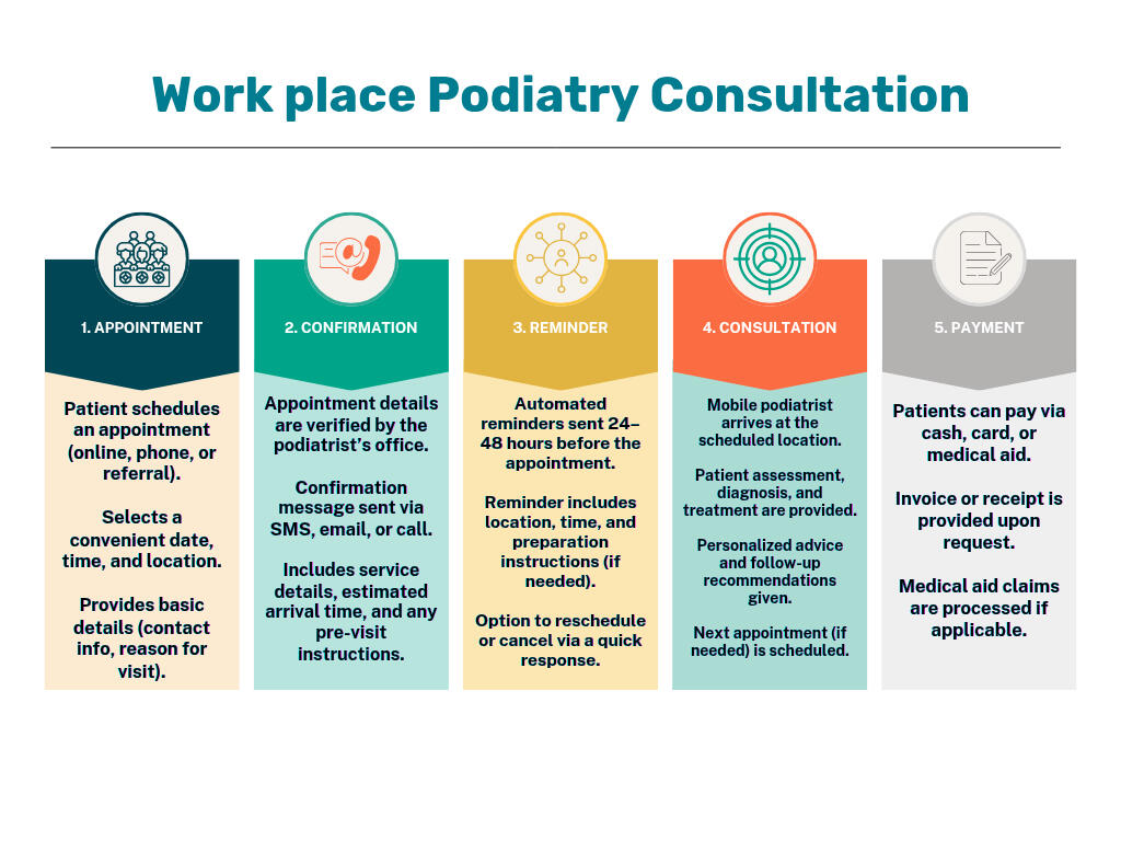 1. Appointment Booking> lPatient schedules an appointment online, via phone, or through a referral.> Selects a preferred date, time, and designated location.> Provides basic details (contact info, reason for visit).2. Confirmation> Appointment details are verified by the podiatrist’s office.> A confirmation message is sent via SMS, email, or call.> Includes service details, estimated arrival time, and any pre-visit instructions.3. Check-in & Preparation> Patient arrives at the designated location at the scheduled time.> Completes any necessary paperwork (if required).> Consultation area is prepared for assessment and treatment.4. Consultation & Treatment> Podiatrist assesses, diagnoses, and provides treatment.> Personalized advice and follow-up care recommendations are given.> Next appointment (if needed) is scheduled.5. Payment & Documentation> Patients can pay via cash, card, or medical aid.> Invoice or receipt is provided upon request.> Medical aid claims are processed if applicable.